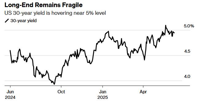 自 4 月初以来,美国 30 年期国债收益率持续攀升,于 5 月 22 日达到 5.15%的峰值,这是自 2023 年以来的最高水平。周一该收益率为 4.95%,下跌了 2 个基点,而美国 10 年期国债收益率也下跌了相同幅度,至 4.48%。